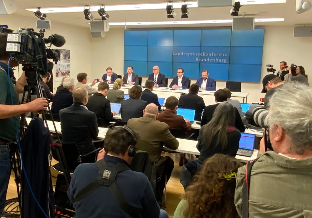 Landespressekonferenz: Vorstellung des Koalitionsvertrages "Verantwortung für Brandenburg"Es ist ein Vertrag der neuen Art, den die beiden Landesvorsitzenden Jan Redmann, MdL und Dietmar Woidke heute vorstellten. Kein Papier mit vielen ausverhandelten Details sondern ein Vertrag, der sich an den Herausforderungen unseres Landes orientiert, um u.a. Wohlstand und Arbeit zu sichern, Krankenhausstandorte zu erhalten sowie Digitalisierung und Bürokratieabbau voranzutreiben. Deutlich wird auch, und das ist uns in diesen aufgeheizten Zeiten besonders wichtig: Wir stehen zur Bundeswehr und der Ansiedlung von Rüstungsunternehmen in Brandenburg.Hier finden Sie den Entwurf: https://www.cdu-brandenburg.de/mitgliederbefragung